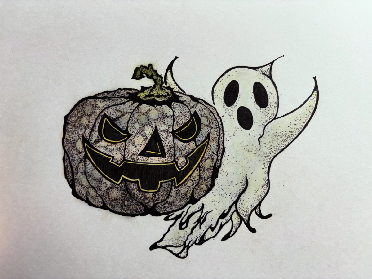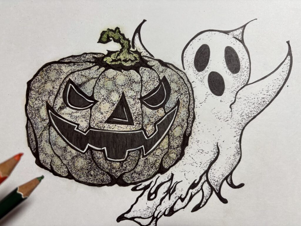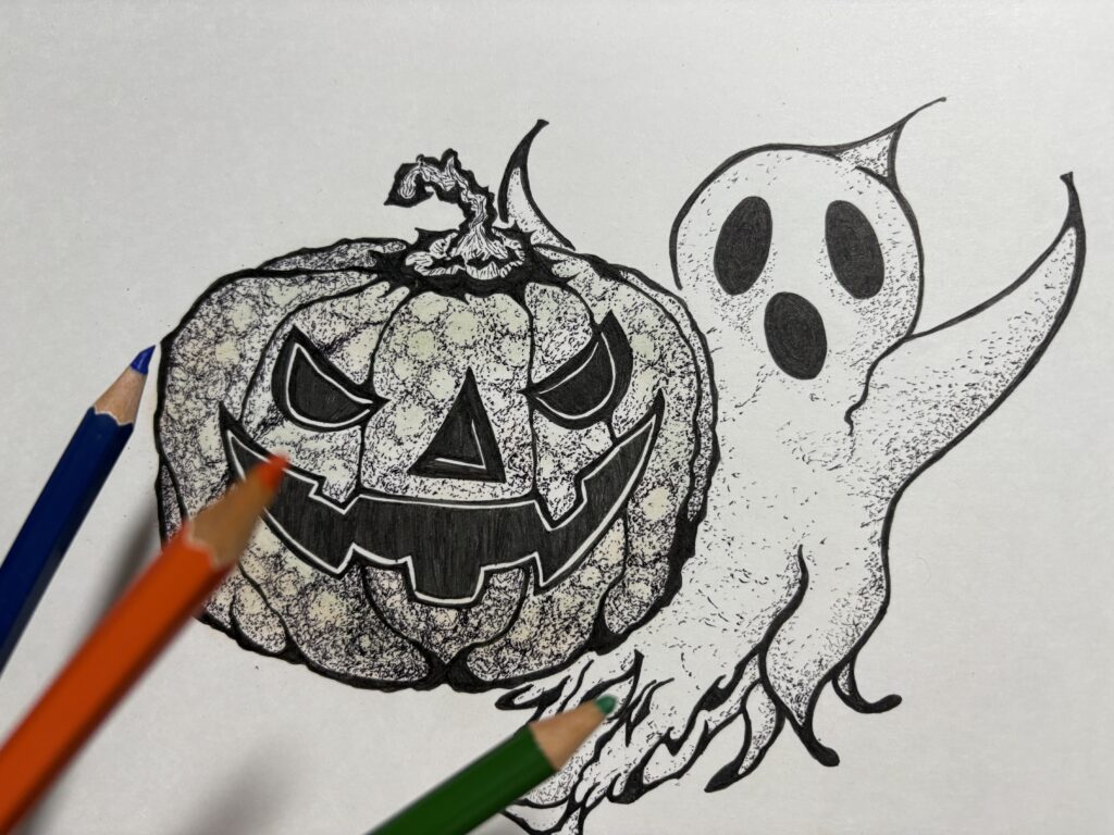 New!!! ハロウィンイラスト2025 イラスト 2025.10.29 まだ途中ですが書き込んでいる過程をほんの少しご紹介します_φ(・ ・ 🖊️🖊️🖊️ あとはカボチャとオバケの周りにそれっぽくなるパーツを書き足して完成かな?